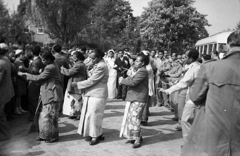 Op 21 mei 1956 trouwden de Molukse Juliana Fernatubun en Dirk Rahangmetan. Uiteraard werden traditionele dansen voor het bruidspaar (zelf op de achtergrond op deze foto) uitgevoerd. Inwoners van de Beerzen, Baarschot en Diessen kwamen in groten getale kijken (links op de foto). Rechts is de bus te zien die het gezelschap naar de kerk had vervoerd.
