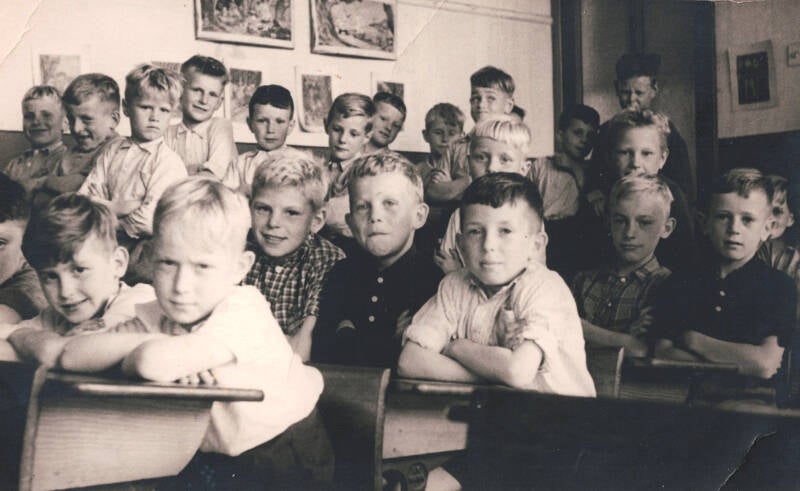 Deze jongensschoolfoto kregen we van Ton Smetsers. Hij is de blonde jongen linksvoor die ons recht in de ogen kijkt. Vermoedelijk is de foto van de 3e of 4e klas gemaakt in 1952 of 1953 in de oude jongensschool in ’t Hoekje, op de hoek Heuvelmansstraat/Laarstraat, net vóórdat de nieuwe jongensschool aan de Molenstraat 5 werd betrokken. Wie de foto heeft gemaakt, is onbekend. Misschien de onderwijzer, meester Harrie Sevens of meester Harrie Vingerhoets.