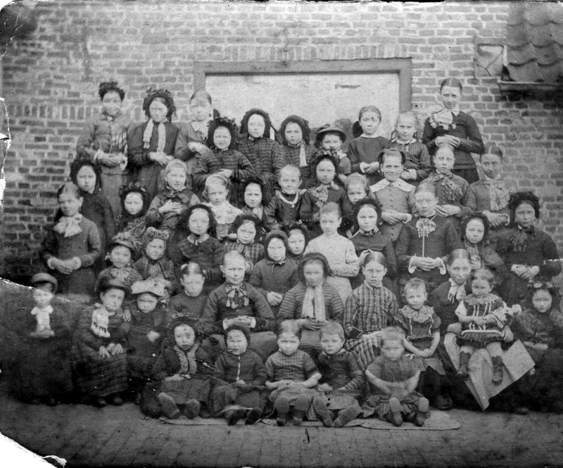 Het is een groep meisjes: oudere, jongere en ook kleuters en op de voorste rij lijken ook jongetjes te zitten. Misschien van de meisjesschool. Zo te zien aan de (armoedige) kleding dateert de foto van omstreeks 1900. In onze verzameling hebben we een soortgelijke afbeelding uit 1909, die al eerder in deze rubriek is geplaatst als FSD-05057. Op onze website www.erfgoeddiessen.nl is deze te vinden onder ‘Diessens Fotoalbum’ onder het trefwoord ‘meisjesschool’. Het is ook mogelijk dat de kinderen op deze foto weeskinderen zijn. Het Diessense zustersklooster bood aan het eind van de negentiende eeuw opvang aan weeskinderen. Het is overigens niet eens zeker dat de foto in Diessen gemaakt is. Een andere mogelijkheid is dat de mensen op de foto Belgische vluchtelingen zijn, die in de Eerste Wereldoorlog (1914-1918) de grens over trokken naar Nederland. In de kloosterkronieken lezen we dat op 4 oktober 1914 ’s avonds drie vrouwelijke Belgische vluchtelingen bij het klooster aanklopten. Twee dagen later nog eens drie zusters met in hun kielzog dertig weeskinderen. De Zusters van Liefde ruimden meteen plaats in voor hen in de paterskamer en twee spreekkamers. Een maand later vertrokken de vluchtelingen, waarschijnlijk naar een opvangkamp elders in het land.
