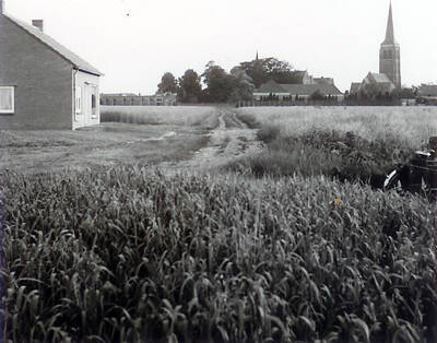 De Rijtseweg is nu de verbindingsweg van de Julianastraat naar de Molenstraat. Toen Gust deze foto maakte, in augustus 1960, was de Rijtseweg nog maar een karrespoor (kèrspoor), waarlangs één huisje stond, dat van de familie Van Korven-Heuvelmans. Op de achtergrond zien we de kerktoren en het torentje van de kloosterkapel. Daarvóór is de jongensschool aan de Molenstraat zichtbaar. Deze is in 1984 gesloopt. Nu staat daar sport- en partycentrum Hercules. Links achter is de oude meisjesschool nog te zien. Die is in 1971 gesloopt. De fiets rechts staat tegen de omheining van het RKDSV-sportveld